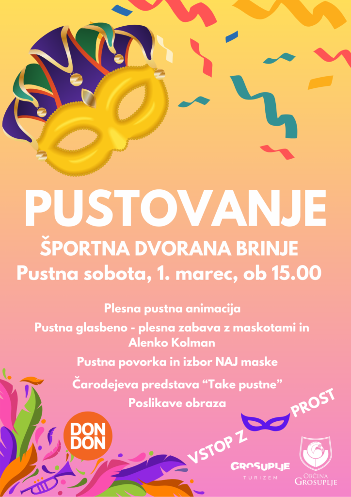 Ob izteku zimskih počitnic pa se ne pozabite udeležiti PUSTOVANJA. Pustna zabava se bo odvila v soboto, 1. marca, s pričetkom ob 15. uri v Športni dvorani Brinje.