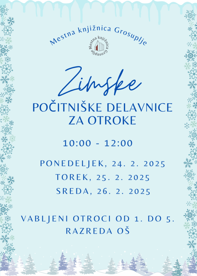 > V času zimskih počitnic bodo v Mestni knjižnici Grosuplje organizirali počitniške delavnice za otroke od 1. do 5. razreda OŠ v ponedeljek, 24. 2., torek, 25. 2., in sredo, 26. 2., od 10:00 do 12:00.